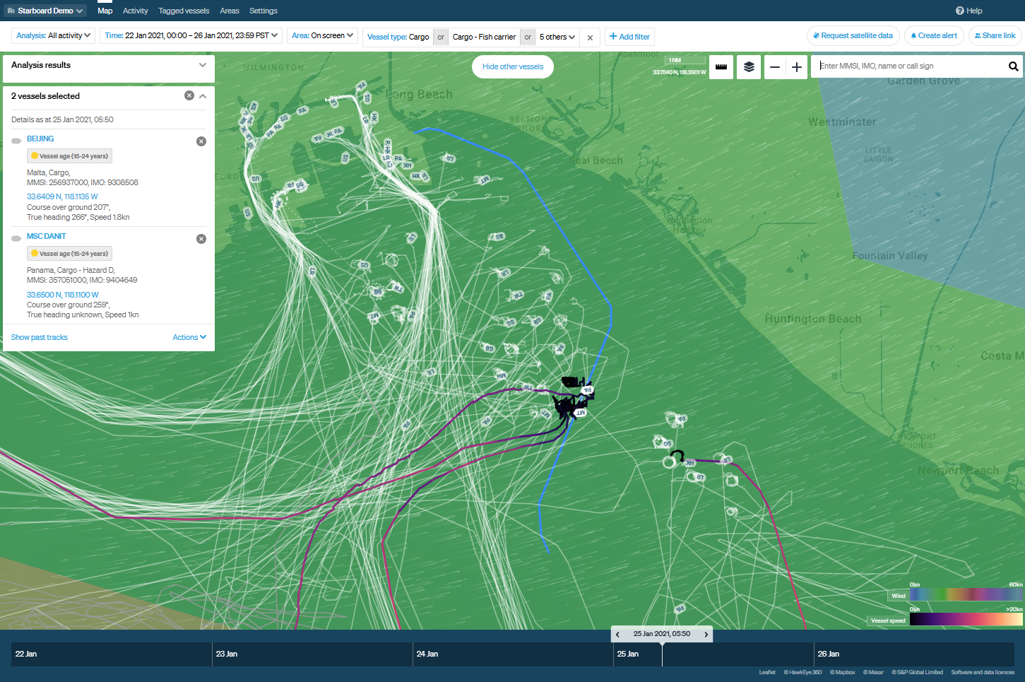 Starboard view of Beijing and MSC Danit dragging anchor over the San Pedro Bay pipeline near Huntington Beach on 25 January 2021.